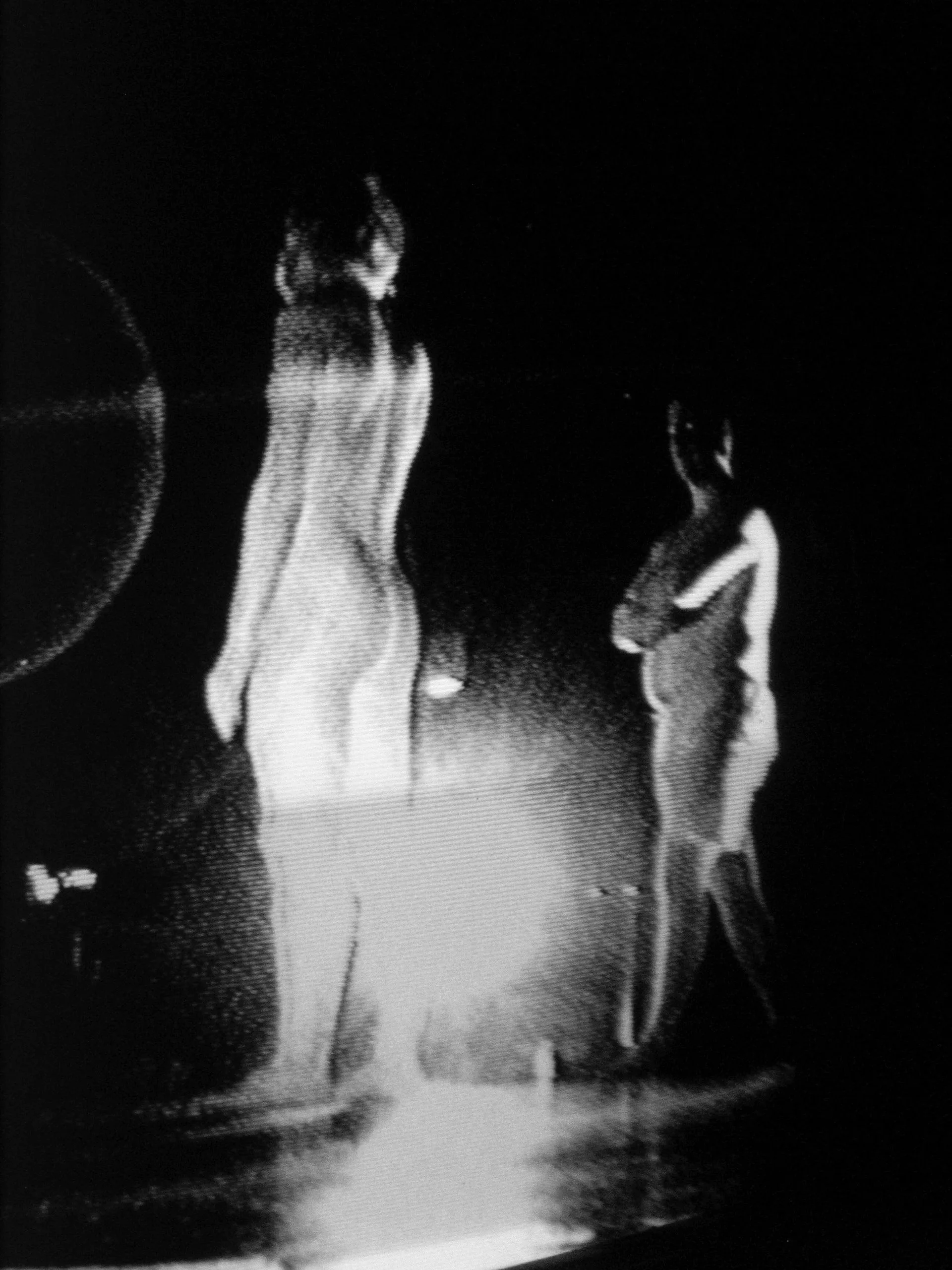 Esitystilanne tapahtui kokonaan pimeässä ja tilannetta kuvattiin pimeäkameroilla, joiden välittämää kuvavirtaa välitettiin pienille mustavalkoruuduille. Yksi esityksen tavoitteista oli nostaa esiin “kosketuksen fantasioita”. Ja siksi piti tietenkin olla alasti! Kuvan harjoitustilanteessa minä vielä nynnyilin ja pidin shortsit jalassa.